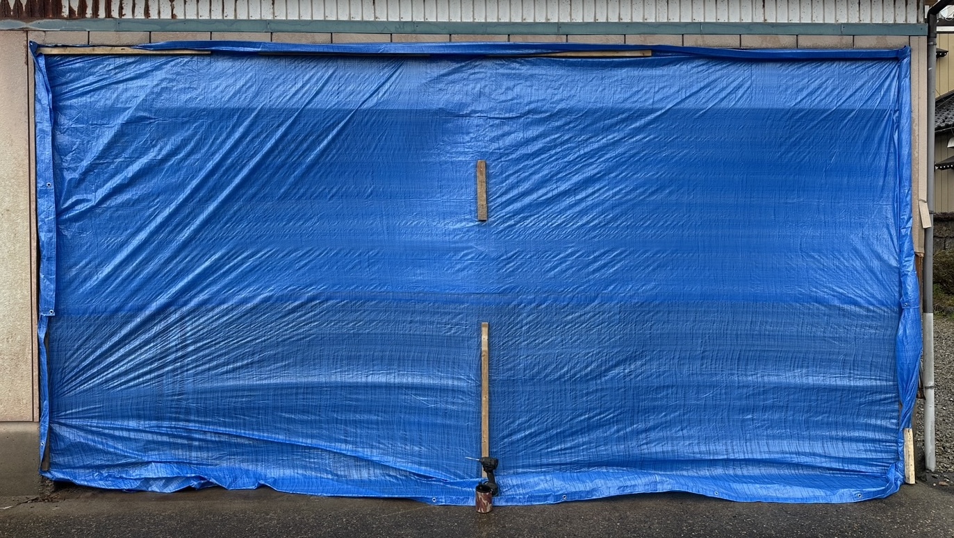 シャッター外し後大工さんの施工が必要な内容でしたので、それまでの数日間はブルーシートで対応させていただきました💡